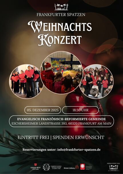 Herzliche Einladung zum Weihnachtskonzert der Frankfurter Spatzen! Am Freitag, 5. Dezember 2025 um 18.30 Uhr in der Evangelischen Französisch-reformierten Gemeinde, Eschersheimer Landstr. 393, Frankfurt.